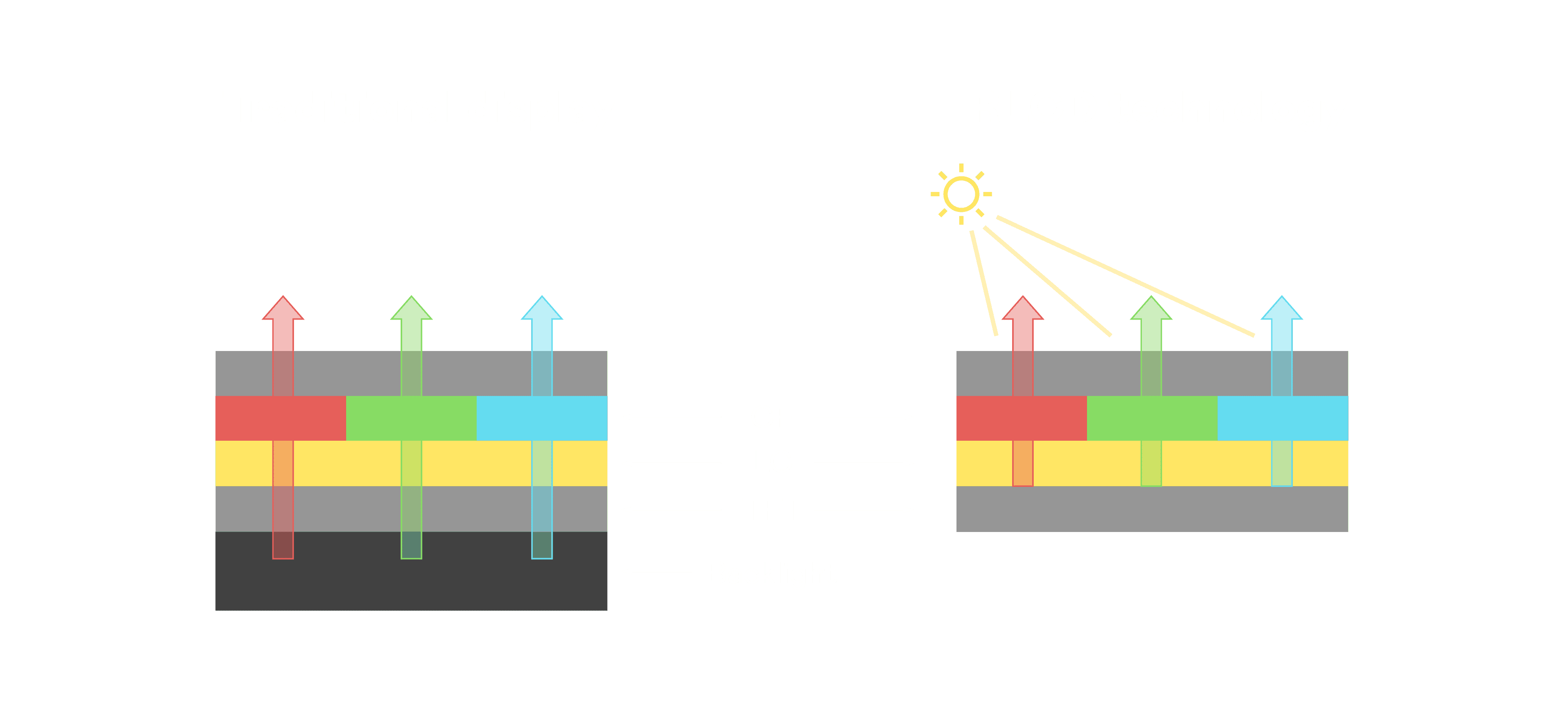与传统需搭配背光单元的液晶显示相比,,,反射式液晶技术不仅更省电、、、、更轻薄,,,且即便在艳阳下仍能清晰显示。。。此外,,少了背光单元,,也大幅降低了 LED 蓝光伤害眼睛的疑虑。。