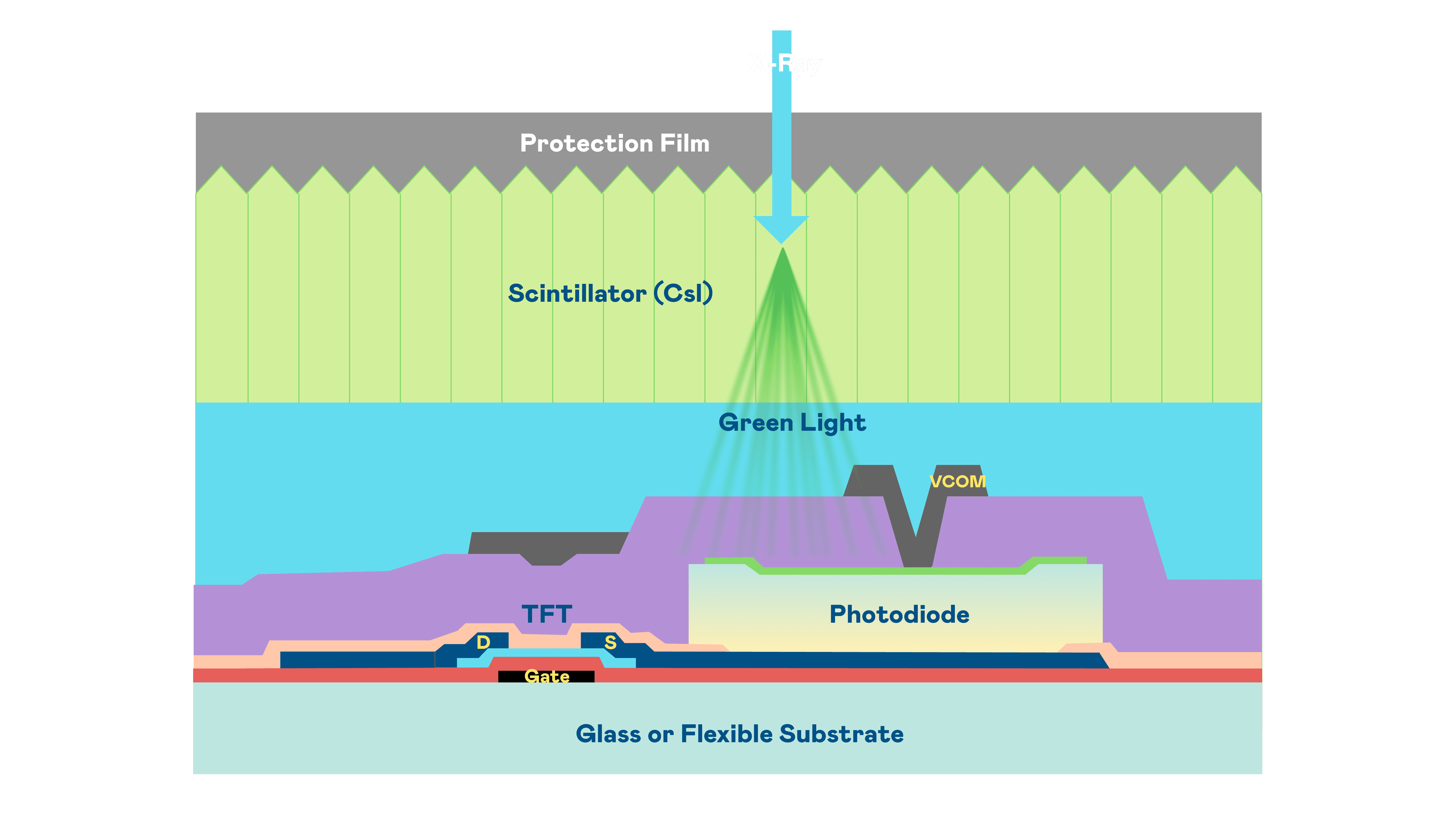 尊龙集团的X光影像感测阵列使用薄膜电晶体 (TFT) 作为每个像素的读取开关,,搭配光电二极体(Photodiode)的光电转换元件,,,用以感测X光影像讯号。。